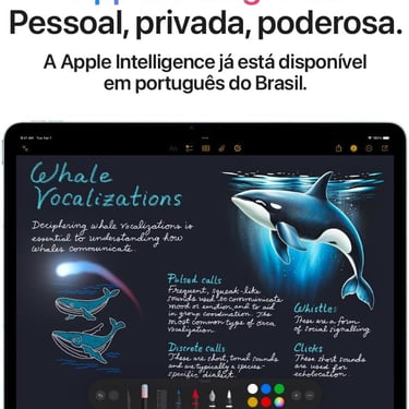 APPLE PENCIL E MAGIC KEYBOARD — O Apple Pencil Pro transforma o iPad Air numa tela em branco e no melhor bloco de notas do mundo. O Apple Pencil (USB-C) também é compatível com o iPad Air. O Magic Keyboard para iPad Air permite escrever de uma forma incrivelmente cómoda, tem trackpad integrado, 14 teclas de função e também serve de capa protetora. Acessórios vendidos à parte.